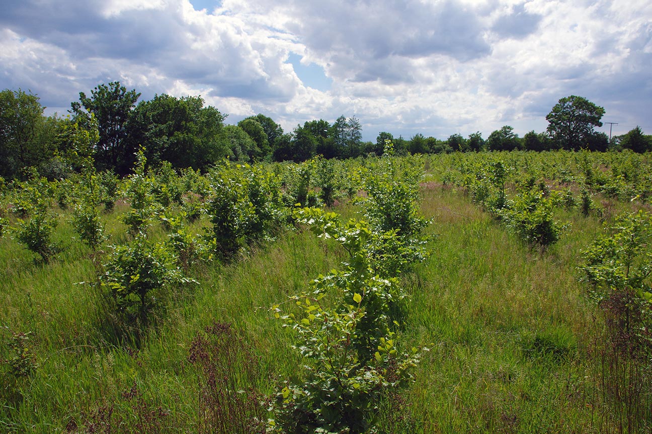 Die Fläche ist in den 2010er-Jahren von der Stiftung Klimawald bepflanzt worden. 11,5ha neuer Wald sind entstanden. Auf dieser Fläche werden in den nächsten Jahren mindestens 11.000t reines CO2 in Form von zuwachsendem Holz gebunden und damit der Atmosphäre entzogen werden.