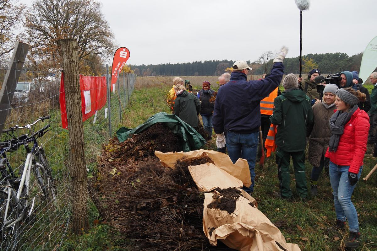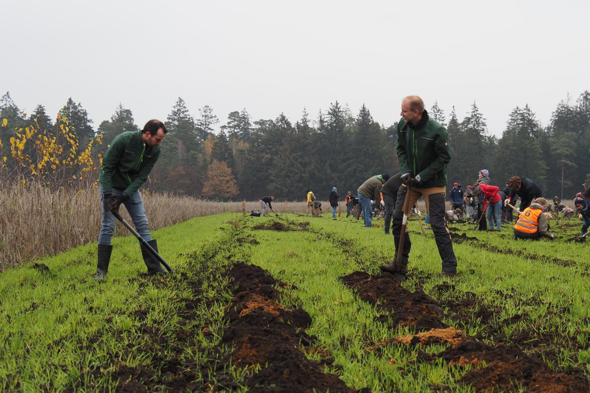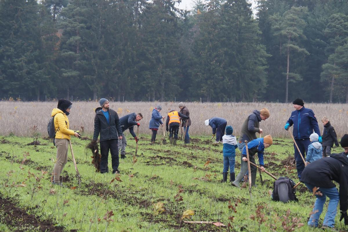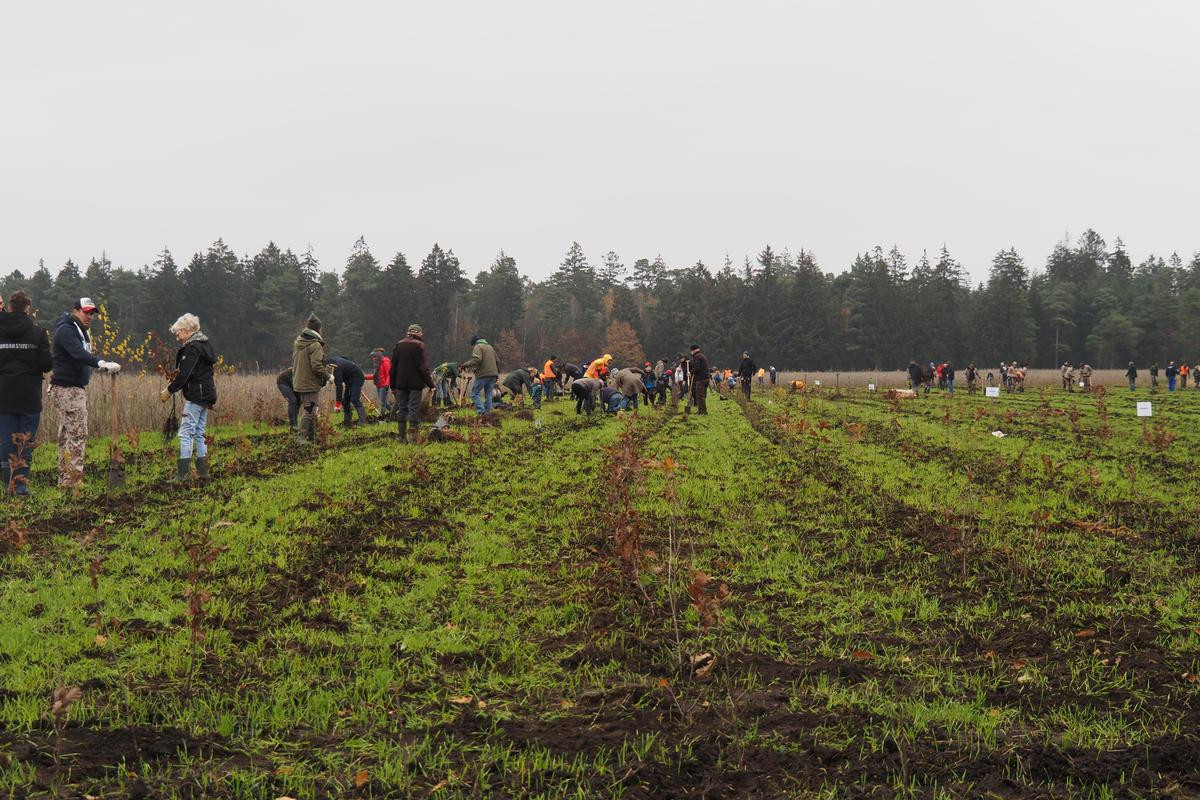Dieser Klimawald ist knapp sechs Hektar groß und liegt in der Gemeinde Bark, im Kreis Segeberg. Die Aufforstung begann im Spätherbst 2023 und wurde im Rahmen einer großen öffentlichen Pflanzaktion mit der Bepflanzung des „letzten Hektars“ am Samstag, 16. November 2024 abgeschlossen. Allein an diesem Tag waren rund 150 Aktive, von jung bis alt, auf der Fläche und haben die letzten rund 5.000 kleinen Bäume gepflanzt. Neben Bürgerinnen und Bürger aus Bark und Umgebung schwangen auch die Mitarbeitenden der Sparkasse Südholstein in großer Anzahl sowie der BMS die Spaten. Ebenfalls in besonderer Erinnerung mit diesem Pflanztag bleibt Allen wohl das Vorfahren des Möbel Kraft-LKWs, dem rund 20 Translogistik-Azubis entstiegen, die gleich mitpflanzend ins Geschehen eingriffen und mit großem Spaß dabei waren.